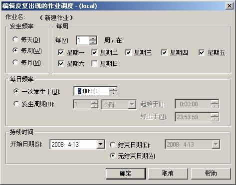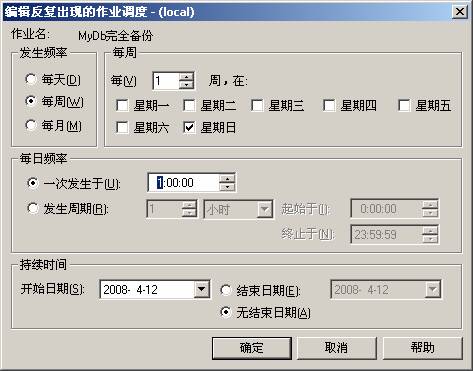 圖三 數(shù)據(jù)完全備份的步驟 我們對(duì)照上圖,注意兩點(diǎn),第一個(gè)是步驟1“成功時(shí)”這一列的顯示,當(dāng)成功的時(shí)候轉(zhuǎn)到下一步,“失敗時(shí)”當(dāng)失敗的時(shí)候失敗后退出,步驟2“成功時(shí)”當(dāng)成功的時(shí)候成功后退出,“失敗時(shí)”當(dāng)失敗時(shí)失敗后退出。確保兩個(gè)步驟對(duì)數(shù)據(jù)操作的正常。 再執(zhí)行“調(diào)度”一欄,主要實(shí)現(xiàn)在什么時(shí)候執(zhí)行這些作業(yè),我們定在每周日一點(diǎn)的時(shí)候開始執(zhí)行,如圖四: