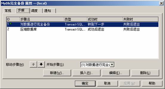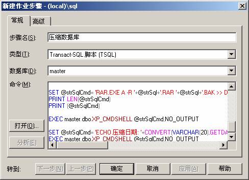 圖一 建立作業(yè)對(duì)數(shù)據(jù)庫(kù)進(jìn)行完全備份 然后開始執(zhí)行對(duì)數(shù)據(jù)庫(kù)的壓縮,在步驟中再新建一個(gè)作業(yè),步驟名為“壓縮數(shù)據(jù)庫(kù)”,然后在命令框中輸入如下的SQL代碼: DECLARE @strSql VARCHAR(1000), @strSqlCmd VARCHAR(1000), @timeDateDiff INT, @strWeekDay VARCHAR(20) SET @timeDateDiff=DATEDIFF(week,0,GETDATE()) SET @timeDateDiff=CASE DATEPART(WEEKDAY,GETDATE()) WHEN 1 THEN @timeDateDiff-1 ELSE @timeDateDiff END SET @strSql='D:\DataBase\BackData\MyDb_' -- 備份目錄及備份的文件頭 +CONVERT(CHAR(8),DATEADD(week,@timeDateDiff,0),112) -- 完全備份日期 +'_0100' -- 完全備份時(shí)間 +'完全備份' SET @strWeekDay= CASE DATEPART(WEEKDAY,GETDATE()) WHEN 1 THEN '星期天' WHEN 2 THEN '星期一' WHEN 3 THEN '星期二' WHEN 4 THEN '星期三' WHEN 5 THEN '星期四' WHEN 6 THEN '星期五' WHEN 7 THEN '星期六' END SET @strSqlCmd='ECHO 壓縮開始日期: '+CONVERT(VARCHAR(20),GETDATE(),120)+' '+@strWeekDay+' >> D:\DataBase\BackData\CompressDataBase\MyDb_'+CONVERT(CHAR(6),DATEADD(week,@timeDateDiff,0),112)+'.txt' exec master.dbo.XP_CMDSHELL @strSqlCmd,NO_OUTPUT SET @strSqlCmd='RAR.EXE A -R '+@strSql+'.RAR '+@strSql+'.BAK >> D:\DataBase\BackData\CompressDataBase\MyDb__'+CONVERT(CHAR(6),DATEADD(week,@timeDateDiff,0),112)+'.txt' PRINT LEN(@strSqlCmd) PRINT (@strSqlCmd) exec master.dbo.XP_CMDSHELL @strSqlCmd,NO_OUTPUT SET @strSqlCmd='ECHO 壓縮日期: '+CONVERT(VARCHAR(20),GETDATE(),120)+' '+@strWeekDay+' >> D:\DataBase\BackData\CompressDataBase\MyDb_'+CONVERT(CHAR(6),DATEADD(week,@timeDateDiff,0),112)+'.txt' exec master.dbo.XP_CMDSHELL @strSqlCmd,NO_OUTPUT 操作如圖二: