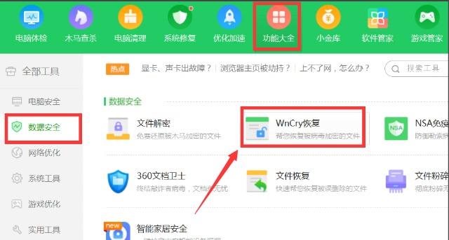 目前各大電腦防護(hù)類軟件都針對勒索病毒推出了相關(guān)解決方案,如果電腦文件不小心感染了勒索病毒造成文件被惡意加密,我們可以通過專殺工具進(jìn)行恢復(fù)。如圖所示,切換到“實(shí)用工具”-“數(shù)據(jù)安全”選項(xiàng)卡,點(diǎn)擊“WnCr恢復(fù)”按鈕以安裝此工具。
