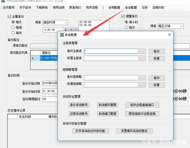 ![]() 在如圖所示的“安全配置”界面中,大勢至服務(wù)器文件備份系統(tǒng)可以針對“注冊表”、“組策略”進(jìn)行備份及恢復(fù)操作,還可以對“系統(tǒng)賬戶”、“系統(tǒng)服務(wù)”、“遠(yuǎn)程桌面端口”等系統(tǒng)安全項(xiàng)進(jìn)行有效管理。