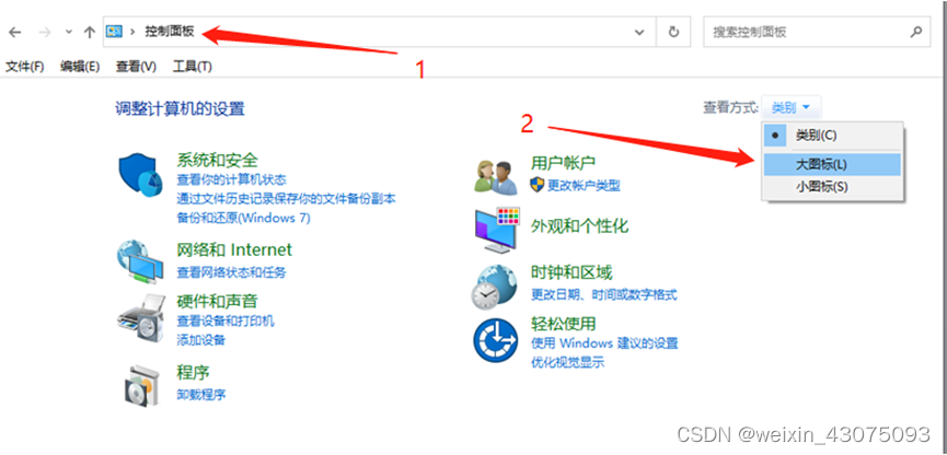 1、打開控制面板,設置為大圖標顯示,如下圖: