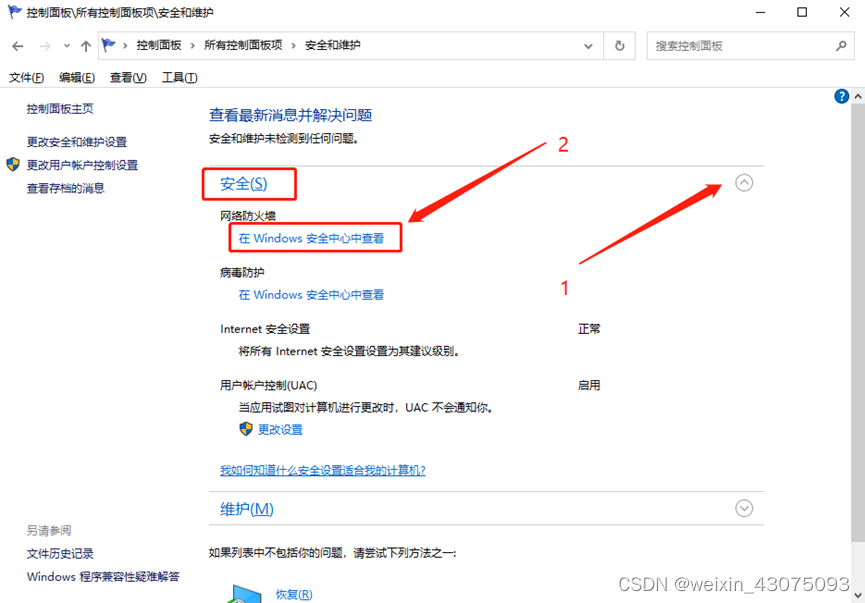 3、展開“安全”,點“在windows安全中心查看”,如下圖