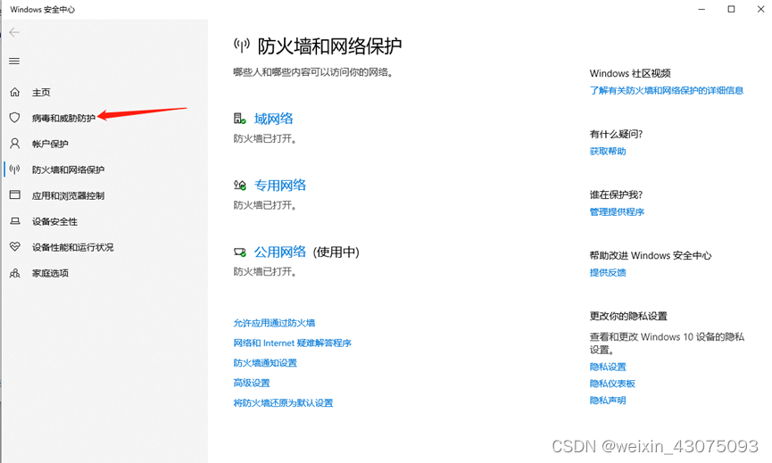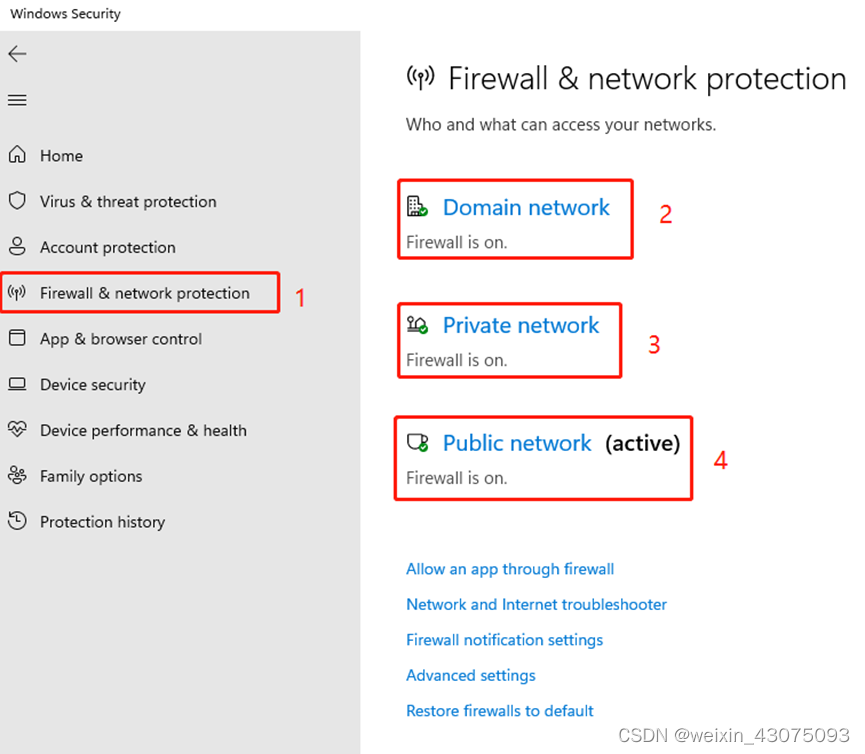 4、點“在windows安全中心中查看”,點 ”firewall & network protection “ ,將2、3、4設置狀態(tài)為on,如下圖: