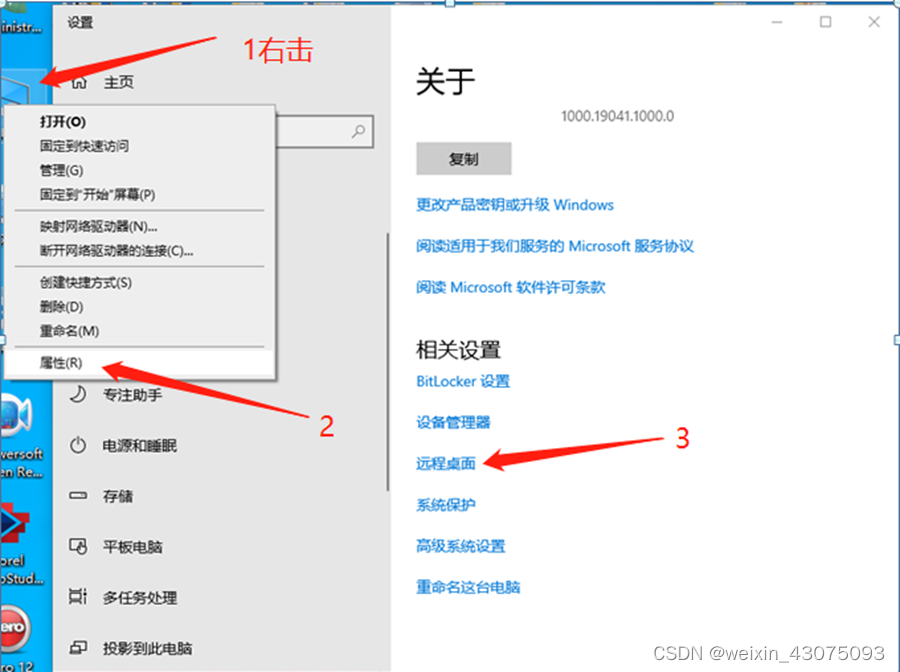1、右擊“此電腦”,“屬性”,“遠程桌面”