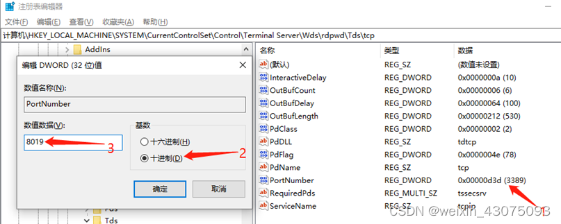 7、雙擊portnumber,默認是3389,修改值為1025-65535中的其中一個,自己知道就OK了,本例修改為8019,如下圖:。