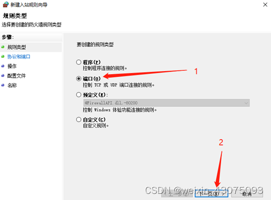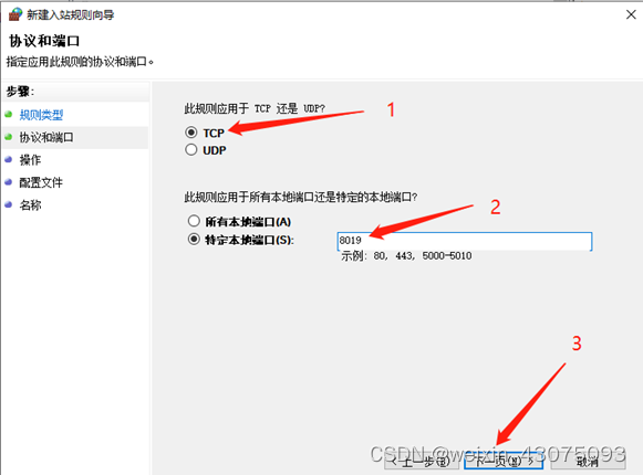 (4)選擇TCP協(xié)議,再輸入要在系統(tǒng)防火墻上開啟的端口號8019,如下圖: