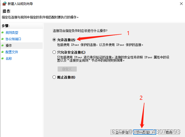 (5)選允許連接,下一步。(如果系統(tǒng)防火墻未開啟,默認是1-65535范圍內的所有端口都是打開狀態(tài),此處我們只開啟1個8019端口號,相對安全)