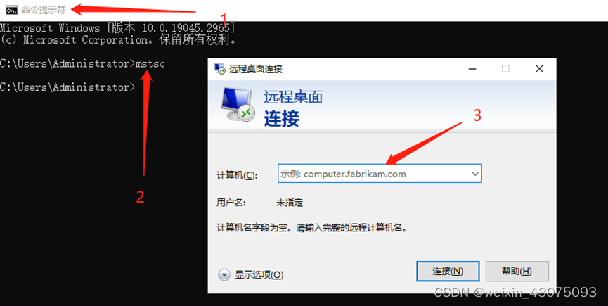 1、執(zhí)行cmd后,再執(zhí)行 mstsc指令,如下圖: