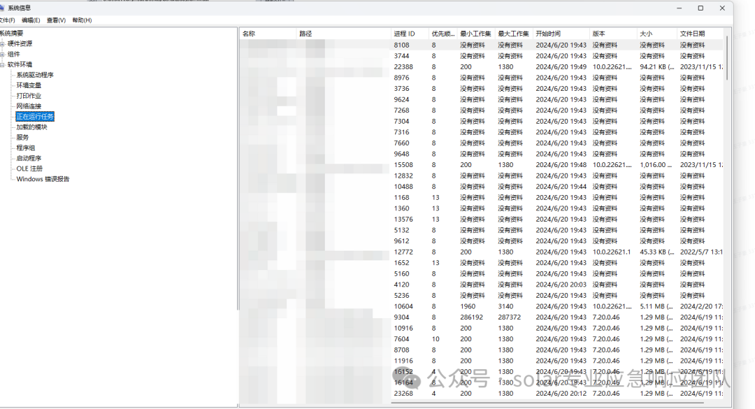 【W(wǎng)in+R】打開(kāi)運(yùn)行框,輸入【msinfo32】命令打開(kāi)系統(tǒng)信息,依次點(diǎn)擊 "軟件環(huán)境 -- 正在運(yùn)行任務(wù)",可以查看到進(jìn)程的詳細(xì)信息,比如進(jìn)程路徑、進(jìn)程ID、文件創(chuàng)建日期以及啟動(dòng)時(shí)間等。