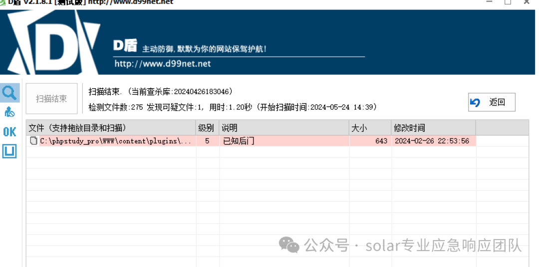 若服務(wù)器搭建系統(tǒng),攻擊者可能通過(guò)系統(tǒng)漏洞上傳Webshell進(jìn)行攻擊利用,可通過(guò)D盾查殺工具進(jìn)行排查檢測(cè),選擇對(duì)應(yīng)文件夾進(jìn)行檢測(cè),右鍵點(diǎn)擊可選擇打開(kāi)當(dāng)前所在文件夾進(jìn)行刪除。