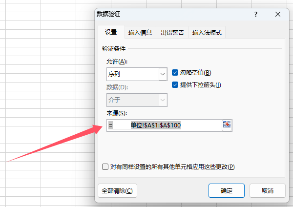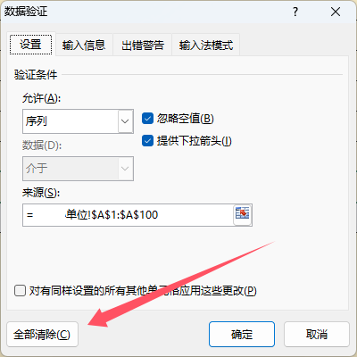 2、在“數(shù)據(jù)有效性”彈出框,依次點(diǎn)擊“全部清除”—“確定”即可。 在Excel2013版中,并沒有這個(gè)有效性項(xiàng)目,改為了“數(shù)據(jù)驗(yàn)證”: