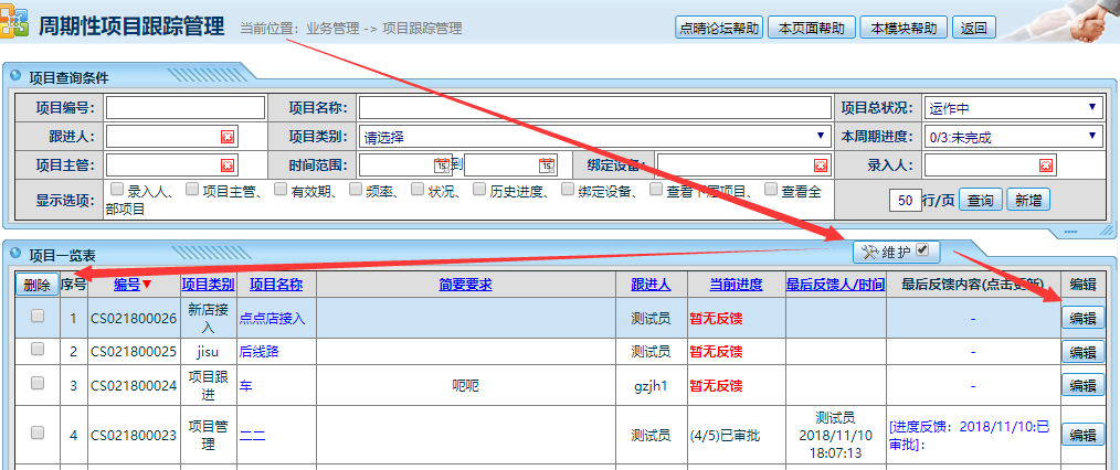 :點晴OA中如何刪除項目跟蹤管理中的任務、類別和進度?![]() 在項目列表中,點擊按鈕維護,就會看到刪除和編輯兩列: ![]() 項目類別和進度分為全局類別和全局進度、個人類別和個人進度。 全局類別和全局進度可以用于所有人,個人類別和個人進度只能用于本人。 必須有權限的才能修改全局類別和全局進度,否則只能更改個人類別和個人進度。 ![]() ![]()