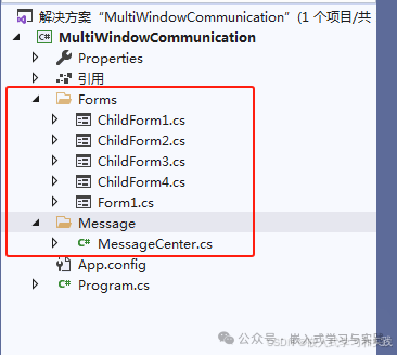 一、多窗口通信方式C#WinForms多窗口通信的方式有:構(gòu)造函數(shù)傳遞屬性傳遞接口事件通信委托回調(diào)靜態(tài)消息中心二、示例代碼C#WinForms中多窗口之間各種通信方式的示例。示例包含一個(gè)主窗口和多個(gè)子窗口,測(cè)試開(kāi)發(fā)中常用的幾種通信方式。項(xiàng)目結(jié)構(gòu)如下:2.1MessageCenter.cs代碼usingSystem;us...