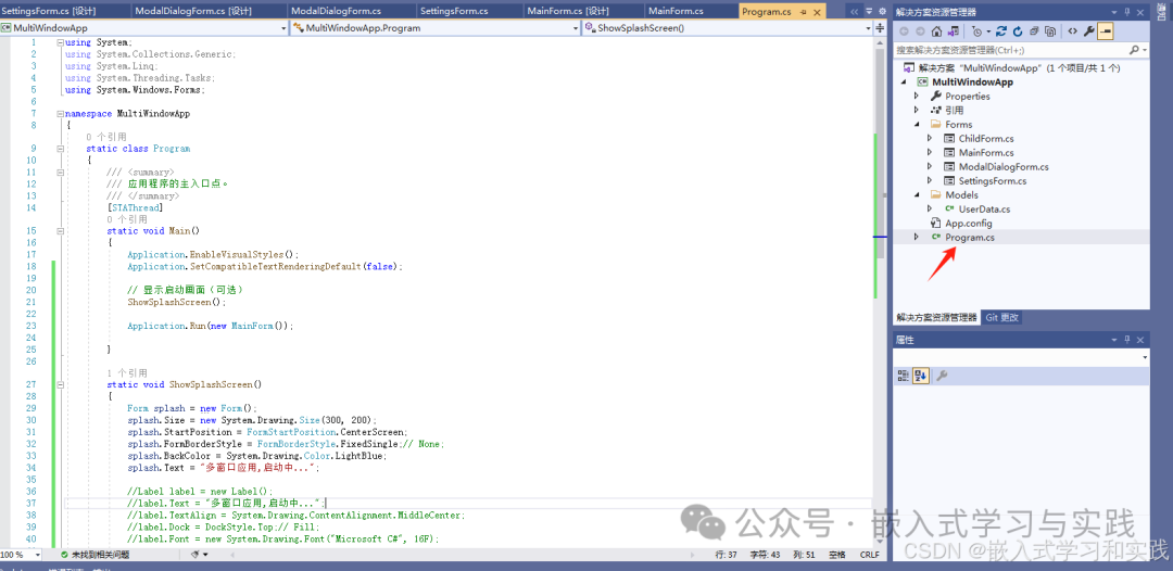 測(cè)試用例WinForms多窗口應(yīng)用示例,包含主窗口、子窗口、模態(tài)窗口和非模態(tài)窗口的創(chuàng)建和管理。1.項(xiàng)目結(jié)構(gòu)和基礎(chǔ)類項(xiàng)目文件結(jié)構(gòu)MultiWindowApp/├──Forms/│├──MainForm.cs│├──ChildForm.cs│├──ModalDialogForm.cs│└──SettingsForm.cs├...