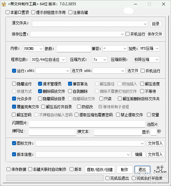 單文件制作工具7.0.2.3855_x86_x64最初由無憂527104427開發(fā),到V7.0.1.1版停止更新,源碼贈(zèng)與有緣人。本工具是一款小巧自定義功能強(qiáng)大的PECMD/7zSFX單文件制作工具,簡(jiǎn)化單文件制作程序步驟,默認(rèn)四步即可制作出一個(gè)單文件,可制作出強(qiáng)大功能的單文件程序。附帶的sfx模塊很多,采用PECMD...