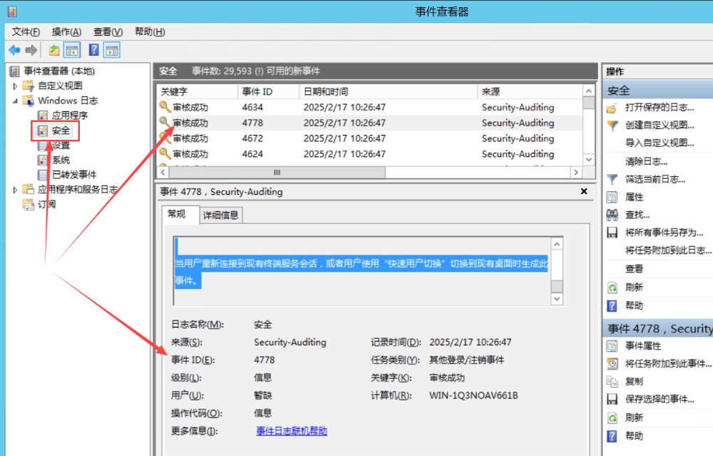 【C#】讀取Windows系統(tǒng)事件查看器中最新遠程桌面用戶成功或失敗登陸記錄查詢時,需要注意事件查看器中的各個狀態(tài)碼和相應內(nèi)容,根據(jù)內(nèi)容靈活設計需要提取的內(nèi)容:DateTimestartDate=newDateTime(2025,2,15);//例如,從2023年1月1日開始EventLogeventLog=newEv...