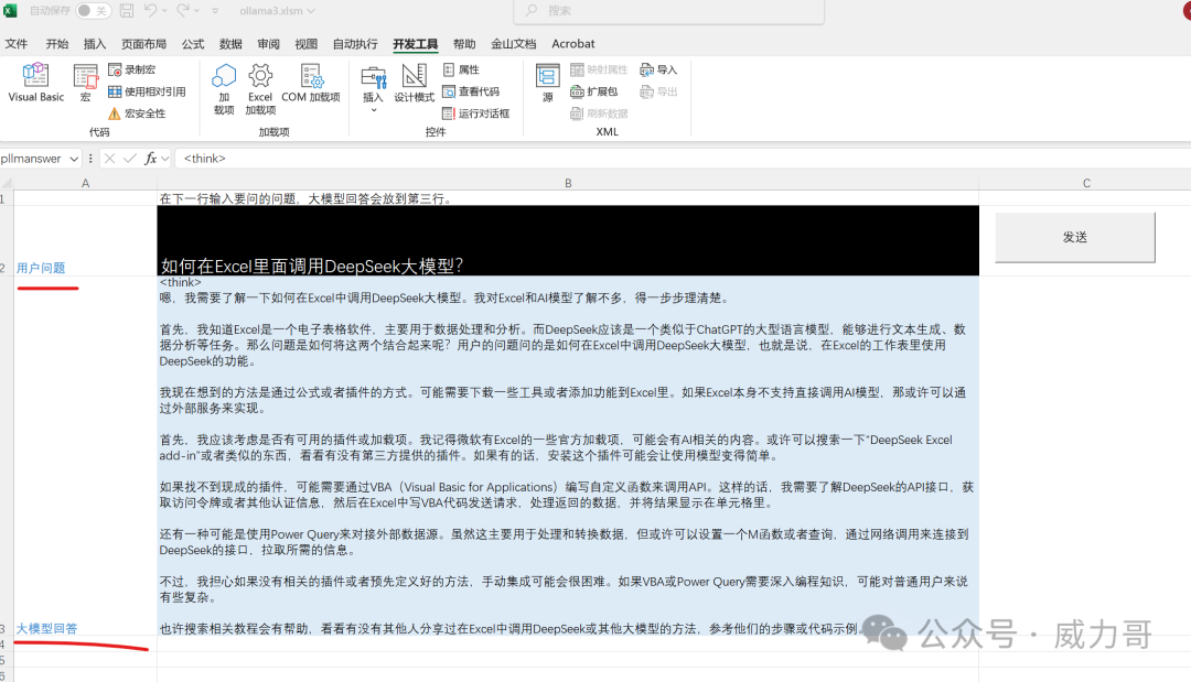 作為Excel的高級用戶,我今天與大家分享如何在Excel中快速接入DeepSeek大模型的方法。當(dāng)然,只要你的模型調(diào)用是符合OpenAPI規(guī)范的,都可以用同樣的方法從Excel文件中來調(diào)用。先上一個最后的效果圖。有了這個Excel文件后,在文件的“Settings”sheet中配置后,用戶在問題格(黑色格)中輸入問題...