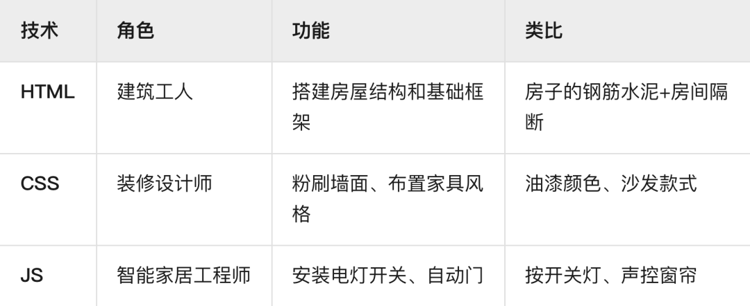 我們上篇解釋了JavaScript是什么。本篇將講解它與HTML、CSS的區(qū)別以及三者如何協(xié)作。學(xué)習(xí)到這里,我相信你已經(jīng)多少意識到這三種技術(shù)存在關(guān)聯(lián)性,但需要更系統(tǒng)的解釋。這是個極其重要的基礎(chǔ)問題,HTML、CSS、JavaScript就像建造一棟房子的三大核心工種,它們各司其職又緊密配合:三者關(guān)系:詳細(xì)區(qū)別對照表三者...
