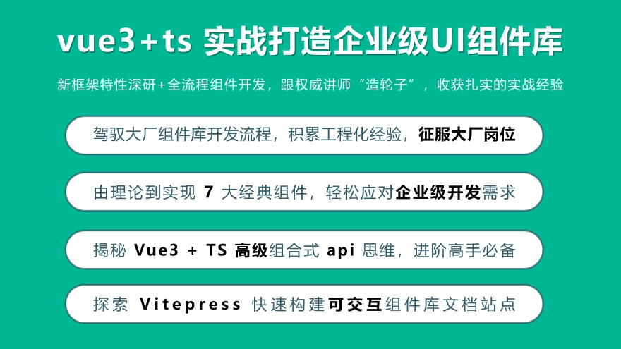 適用人群希望提高就業(yè)競爭力、學(xué)習(xí)組件庫開發(fā)經(jīng)驗的同學(xué)課程概述本課程引領(lǐng)你從零開始,全面掌握Vue3+TS組件庫開發(fā)的核心知識,包括基礎(chǔ)架構(gòu)、文檔站點開發(fā),以及UI組件庫與多人協(xié)同開發(fā)的實戰(zhàn)技能,為你在大廠崗位中脫穎而出奠定堅實基礎(chǔ)。