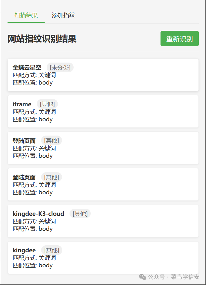 插件簡介@24師傅給發(fā)的一個他寫的基于已收集指紋庫進(jìn)行識別網(wǎng)站指紋的瀏覽器插件,說適合手工打點,能毫秒級出指紋,我現(xiàn)在搞的少,分享給需要的人。插件原理基本架構(gòu)插件采用Chrome擴(kuò)展的標(biāo)準(zhǔn)架構(gòu),包含以下主要組件:manifest.json:擴(kuò)展的配置文件content.js:內(nèi)容腳本,負(fù)責(zé)頁面分析popup.html/...