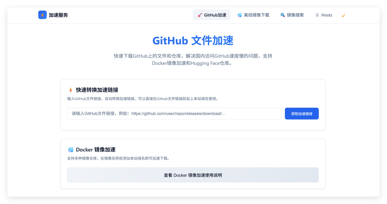 ??網(wǎng)站名稱:HubProxy?網(wǎng)站功能:代理加速服務(wù)??網(wǎng)站簡(jiǎn)介:一個(gè)多功能代理加速服務(wù)工具。主要提供Docker鏡像加速、GitHub文件加速、離線鏡像下載等功能,通過單域名實(shí)現(xiàn)所有功能。??網(wǎng)站網(wǎng)址:點(diǎn)擊打開??開源地址:點(diǎn)擊訪問??Docker和GitHub加速代理服務(wù)器一個(gè)輕量級(jí)、高性能的多功能代理服務(wù),提供...