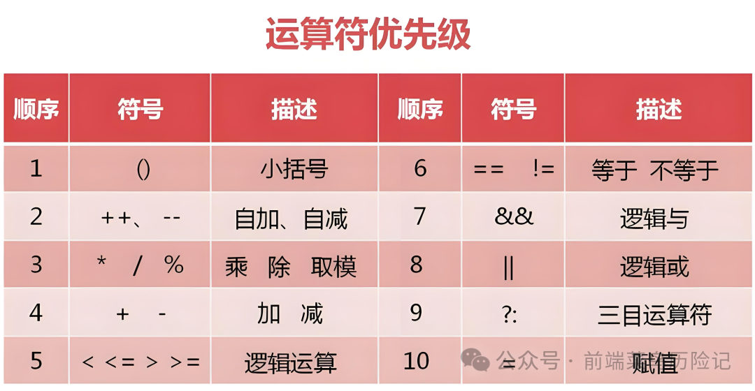 算術(shù)運算符用于數(shù)學(xué)計算,返回數(shù)值結(jié)果。運算符描述示例+加法5+3→8-減法10-4→6*乘法2*6→12/除法15/3→5%取模(余數(shù))10%3→1**指數(shù)(ES6)2**4→16++自增leta=5;a++→6--自減letb=8;b--→7?注意:++a(前置)與a++(后置)的區(qū)別:letx=5;console....