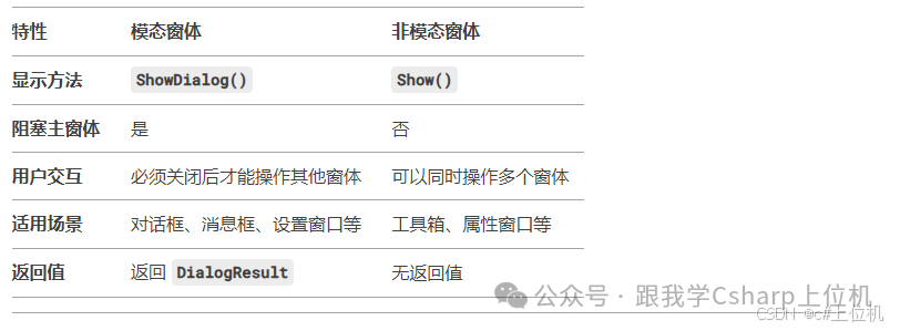 前言:大家好,winform開發(fā)中經(jīng)常需要彈出窗體,有時候需要彈出窗體以后主程序不能往下執(zhí)行,有時候需要主程序的執(zhí)行不能被彈出的窗體阻塞,本文就來介紹如何實現(xiàn)!1、模態(tài)窗體1)定義:模態(tài)窗體是指當窗體顯示時,用戶必須先關(guān)閉該窗體,才能繼續(xù)與應(yīng)用程序的其他部分進行交互。2)特點:窗體以模態(tài)方式顯示時,會阻塞主窗體的操作。...