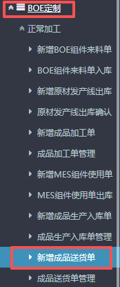 1.進(jìn)入ERP系統(tǒng)之后,點(diǎn)擊“BOE定制”,點(diǎn)開(kāi)“正常加工”,找到“新增成品送貨單”。