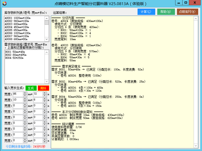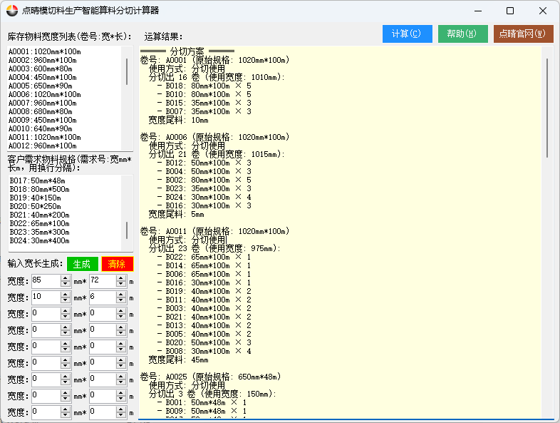 點晴ERP模切料銷售智能分切算料器,是深圳市點晴信息技術有限公司專門為模切行業(yè)推出的一款模切材料銷售分切管理智能算料的程序(從點晴模切ERP系統(tǒng)貿(mào)易版中剝離出來為一個可以獨立運行的程序),可以快速高效的給出最佳分切用料結(jié)果,實現(xiàn)最小分切卷數(shù)、最少浪費的目標。支持逾百個原始在庫物料規(guī)格設置、幾千卷不同規(guī)格的購買物料需求在...