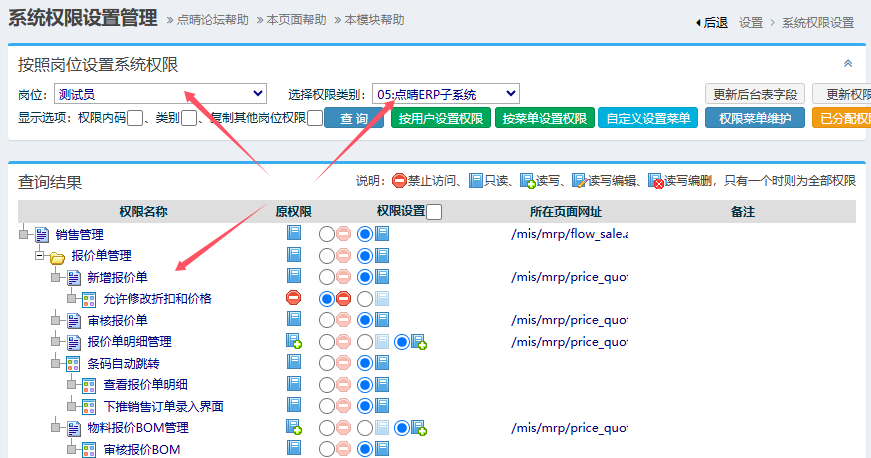 點晴ERP系統(tǒng)中用戶對各個模塊的操作權(quán)限怎么開啟或關(guān)閉?以管理員身份登錄ERP系統(tǒng),找到系統(tǒng)管理-》用戶管理-》用戶權(quán)限維護:?在權(quán)限設(shè)置頁面中,設(shè)置需要開放權(quán)限的崗位,權(quán)限類別選擇:05:點晴ERP子系統(tǒng),然后在下面找到需要開放權(quán)限的明細項目菜單,設(shè)置為允許或禁止訪問權(quán)限,然后保存生效即可:相關(guān)教程:1、關(guān)于點晴OA...