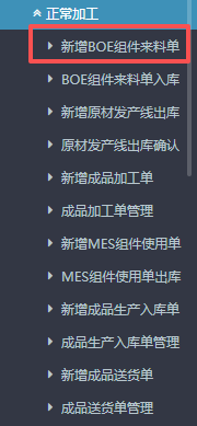 1.進(jìn)入ERP系統(tǒng)之后,在左側(cè)的功能菜單里下方可以找到“BOE定制”,點(diǎn)擊后找到“正常加工”。然后點(diǎn)擊打開(kāi)“新增BOE組件來(lái)料單”。2.進(jìn)入“新增BOE組件來(lái)料單”界面后,先填寫(xiě)好基本的信息:入庫(kù)倉(cāng)庫(kù)、收貨日期。