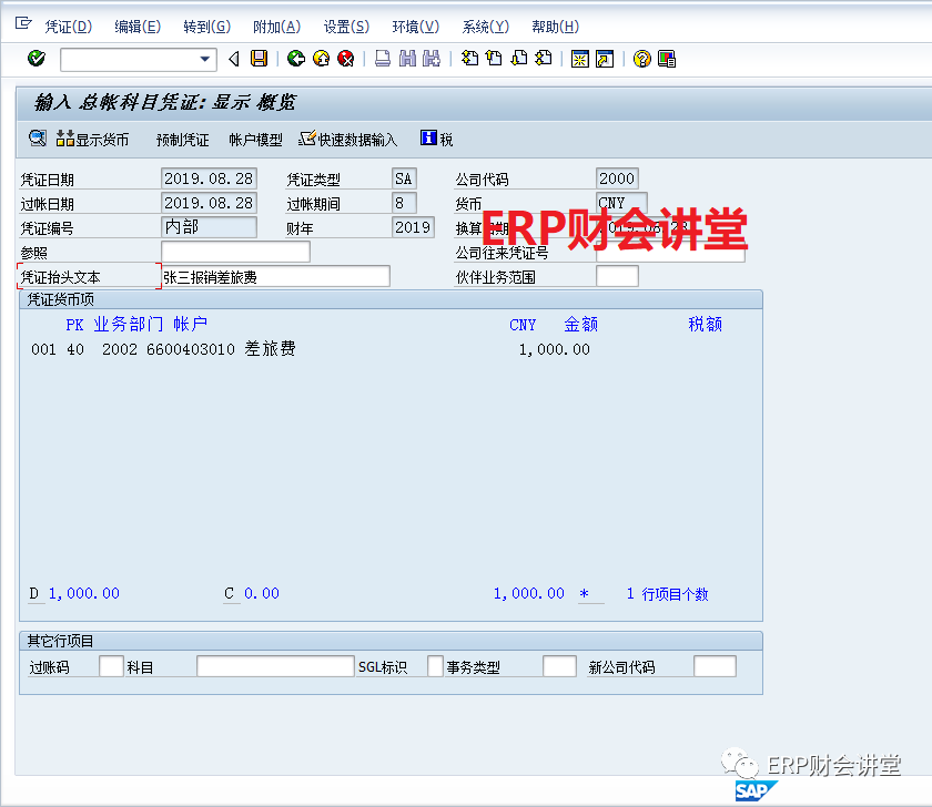 大家在SAP中錄入憑證時(shí),可能會(huì)遇見這種情況,憑證錄入到一半時(shí),領(lǐng)導(dǎo)臨時(shí)交代重要任務(wù),回來的時(shí)候SAP已經(jīng)斷掉了,不得不重新錄入憑證。有的朋友可能會(huì)問,SAP中是否可以臨時(shí)保存憑證呢?這當(dāng)然可以,今天要給大家介紹的就是SAP的憑證暫存功能。例如,張三來報(bào)銷費(fèi)用,剛錄完借方分錄,如下圖,此時(shí),因事需要離開,可以先暫存憑證...