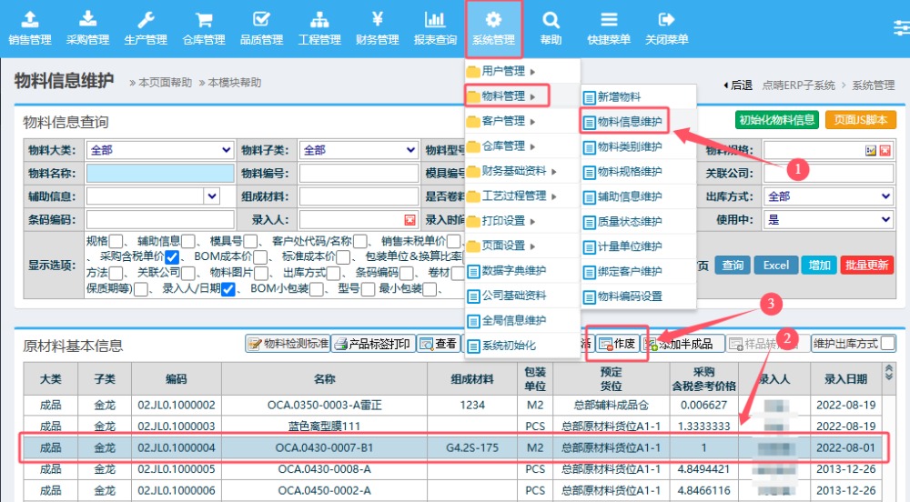 操作步驟:系統(tǒng)管理——物料管理——物料信息維護;進入頁面后如下圖操作: 點擊編輯進入修改頁面;修改后點擊提交即可,修改頁面如下圖所示: