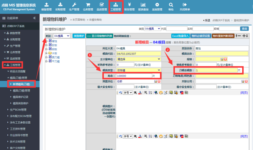 操作步驟:工程管理-模具(刀模)管理-模具(刀模)管理