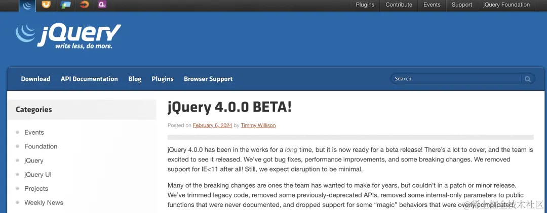 Jquery4.0更新了啥?接下來說一下到底更新了啥?棄用了1x和2x版本,廢棄一些方法這意味著不再去兼容低版本了,未來Jquery將著力于發(fā)展新的版本,棄用了一些方法jQuery.cssNumberjQuery.cssPropsjQuery.isArrayjQuery.parseJSONjQuery.nodeName...