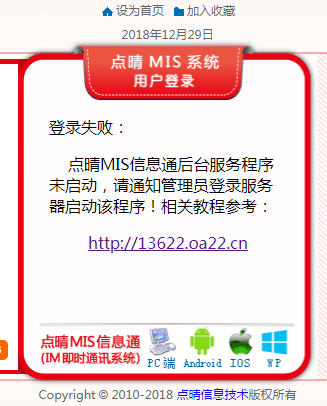 點晴OA提示登錄失敗:點晴MIS信息通后臺服務(wù)程序未啟動,請通知管理員登錄服務(wù)器啟動該程序,如何解決?