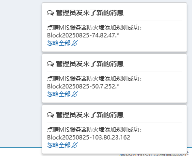 管理員身份登錄到點晴MIS系統(tǒng)時,右下角彈出很多關(guān)于服務(wù)器添加或刪除防火墻規(guī)則成功的提醒窗口,這是怎么回事???