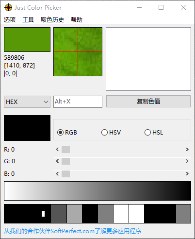JustColorPicker(屏幕取色小工具)功能:一款便攜式取色工具,支持捕捉屏幕任意位置顏色,格式涵蓋HEX、RGB、HSB/HSV、HSL、CMYK、TColor等,還可凍結畫面、鎖定采樣點、放大取色、生成漸變與配色方案,并支持導入導出Photoshop.aco或GIMP.gpl調色板。優(yōu)點:永久免費,無需安裝...