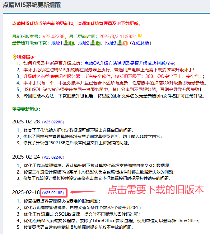已經(jīng)升級到最新版的系統(tǒng),正常情況下不支持降級到以前版本,即使手頭保留了以前舊版升級包,也無法直接安裝降級!考慮到極個別情況下最新版升級包可能會有bug,點晴MIS系統(tǒng)也支持降級到舊版本使用,降級方法如下:1、打開升級包下載頁面(http:/...