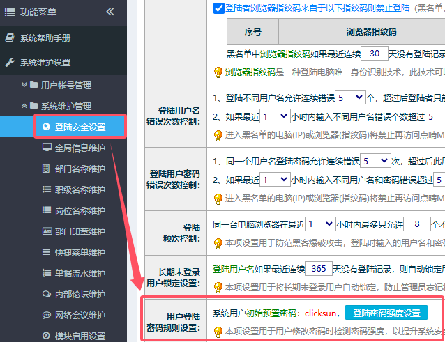 只有密碼為123456,或者管理員預(yù)置的初始密碼(下面這個預(yù)置的是clicksun),才會強制要求用戶登錄時必須先更改密碼。管理員預(yù)置初始密碼位置:設(shè)置-》系統(tǒng)維護設(shè)置-》系統(tǒng)維護管理-》登錄安全設(shè)置,找到“用戶登錄密碼規(guī)則設(shè)置”: