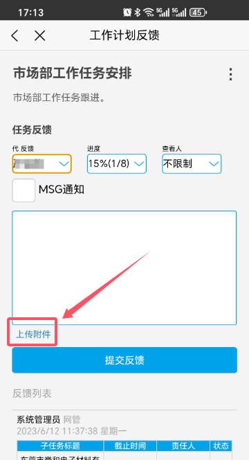 工作計劃在點晴MIS信息通手機APP中能不能在反饋頁面上傳圖片?可以上傳圖片,點擊“上傳附件”即可:
