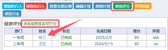 工作計劃完成后,總體進度還是顯示待執(zhí)行點擊績效評分,點擊成員姓名,修改狀態(tài)并評分,對全部成員完成此步驟后,總體進度就會變?yōu)橐淹瓿伞?