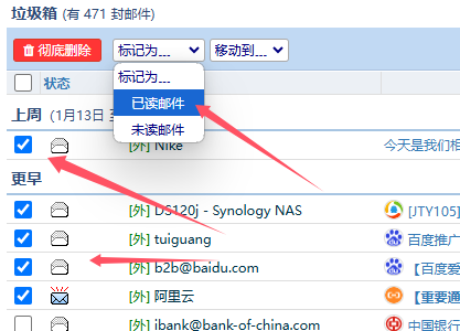 請問Email模塊收件箱中如何批量設(shè)置未讀郵件為已讀狀態(tài)?進入Email郵箱模塊,選中需要標記為已讀的郵件,然后選中上面的“標記為...”-》“已讀郵件”,就可以將選中的郵件一次性批量改為已讀狀態(tài)了。?注意:如果是通過IMAP/SMTP管理的外部郵件,這里將未讀郵件標識為已讀狀態(tài),但其實并沒有真正將郵件收回來,只是取回...