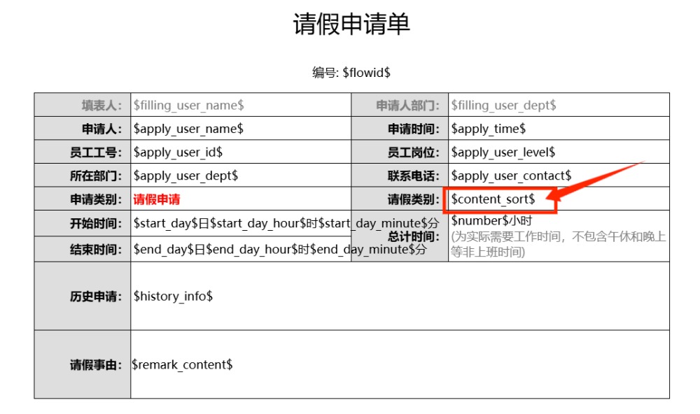 請問工作流請假申請單模板內(nèi)置字段$content_sort$中的類別怎么修改添加新的項(xiàng)目?