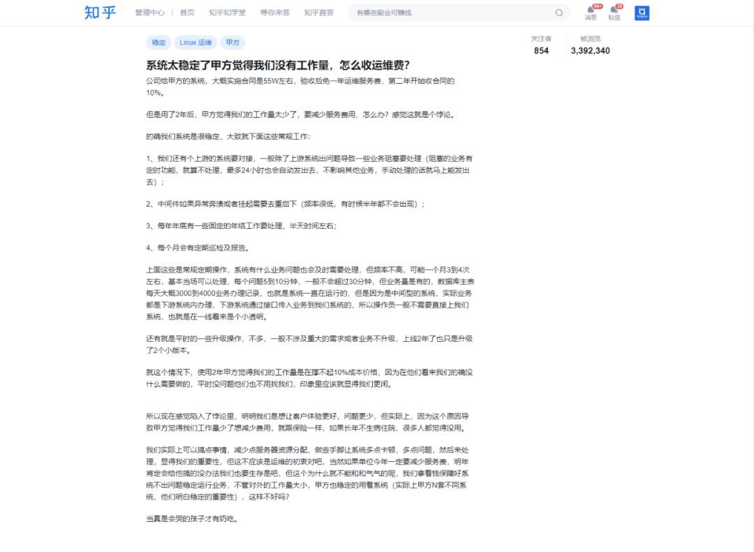 最近,小編在知乎上看到這樣一個問題:系統(tǒng)太穩(wěn)定了,甲方覺得我們沒有工作量,怎么收運(yùn)維費(fèi)?公司給甲方的系統(tǒng),大概實(shí)施合同是55W左右,驗(yàn)收后免一年運(yùn)維服務(wù)費(fèi),第二年開始收合同的10%。但是用了2年后,甲方覺得我們的工作量太少了,要減少服務(wù)費(fèi)用,怎么辦?感覺這就是個悖論。你怎么看?秉持著和平交流的學(xué)習(xí)態(tài)度,小編精選了幾位高...