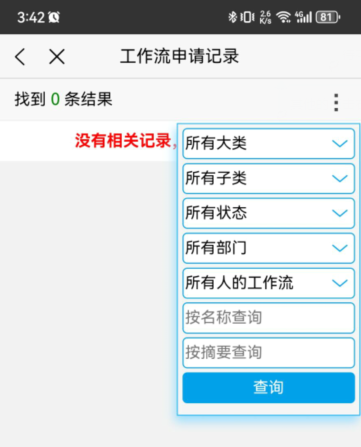 在點(diǎn)晴MIS信息通手機(jī)APP的工作流申請記錄中沒有找到任何審批,已經(jīng)是管理員全部權(quán)限了,如何解決?