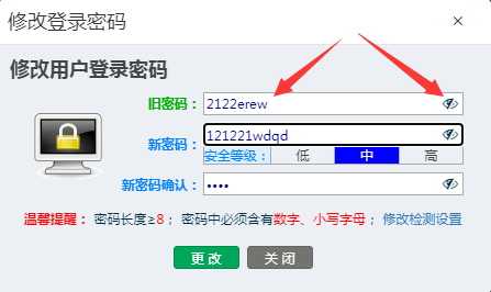 輸入舊密碼時(shí),點(diǎn)擊后面的眼睛圖標(biāo),就可以看到原始密碼文本了:特別說明:如果你的密碼更改頁面上沒有上面的眼睛圖標(biāo),那么就是點(diǎn)晴MIS系統(tǒng)版本太舊,請先聯(lián)系管理員升級點(diǎn)晴MIS系統(tǒng)到最新版(http://u.oa22.cn),再進(jìn)行密碼更改操作即可。