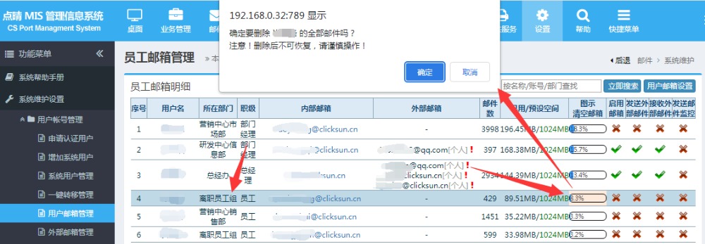 員工辭職了調(diào)整到離職員工組之后郵件也會自動(dòng)清除嗎?不會清除,需要以管理員身份登錄點(diǎn)晴MIS系統(tǒng),在設(shè)置-》系統(tǒng)維護(hù)設(shè)置-》用戶賬號管理-》用戶郵箱管理中,找到離職員工,點(diǎn)擊“圖示清空郵箱”列,手工一鍵清除此離職員工的所有郵件。特別說明:一鍵刪除員工所有郵件功能,只支持對離職員工進(jìn)行此操作,禁止對仍然在職員工進(jìn)行此操作。