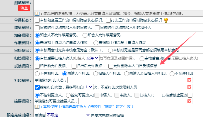 已經(jīng)結(jié)案歸檔的工作流申請,不允許再直接修改工作流申請內(nèi)容,只能通過追加反饋的方式變通實現(xiàn)此需求。設(shè)計工作流流程時,在反饋權(quán)限中,設(shè)置允許反饋: