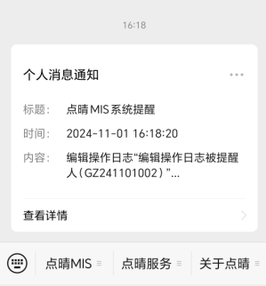 點晴MIS系統(tǒng)最新版支持管理員自行設(shè)置任意類型的操作日志發(fā)送給指定人員,該人員會在操作日志發(fā)生時,實時收到WEB網(wǎng)頁、PC客戶端、手機APP、手機MIS信息通微信/釘釘版提醒。設(shè)置方法如下:、檢查點晴MIS系統(tǒng)版本確保點晴MIS系統(tǒng)版本號不低于V241101A,如...